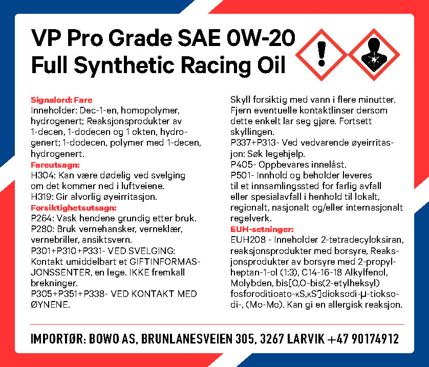 VPs Pro Grade SAE 0W-20 Full Synthetic Racing Oil er formulert ved hjelp av ledende kjemi og avansert teknologi for løpskjøring. Den leverer overlegen holdbarhet og friksjons kontroll for maksimum effekt og beskyttelse.