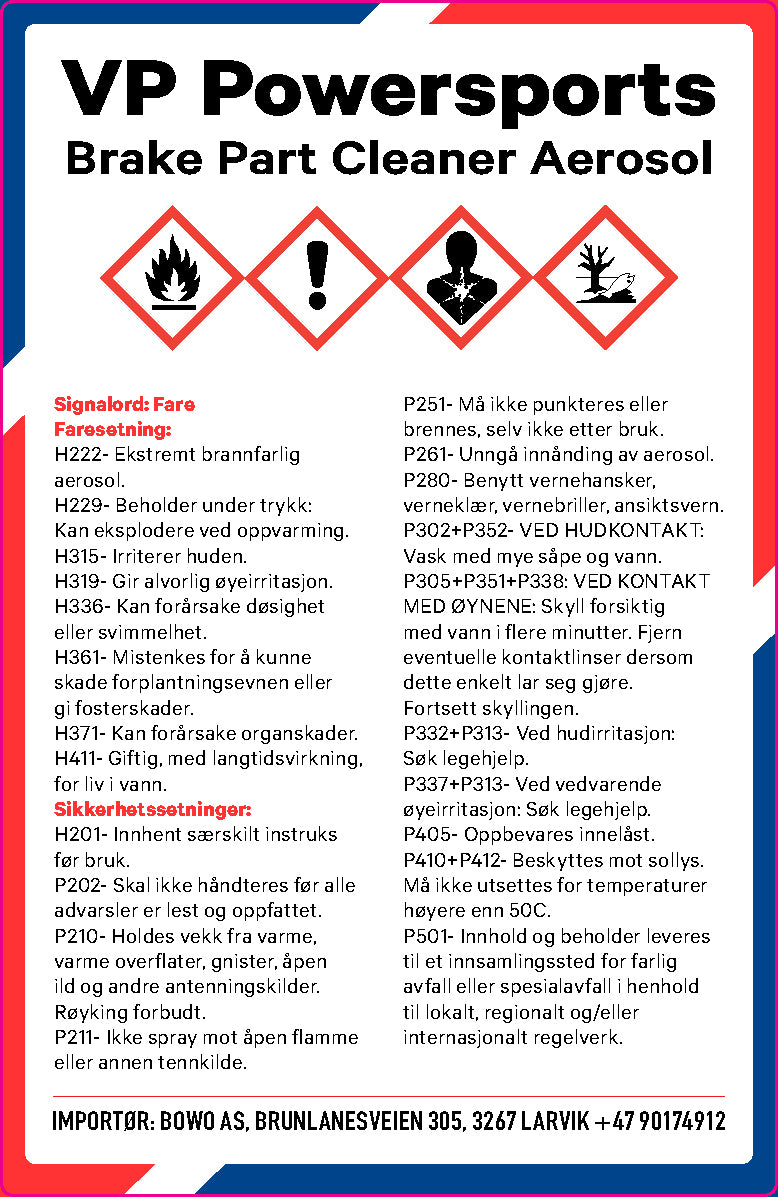 VP Powersports Brake Parts Cleaner Aerosol er en enkel og grei måte å fjerne olje, fett og rester av bremsevæske fra bremse deler. Sprayen løsner og fjerne olje, fett og bremsevæske rester slik at du kan fokusere på å få jobben gjort.